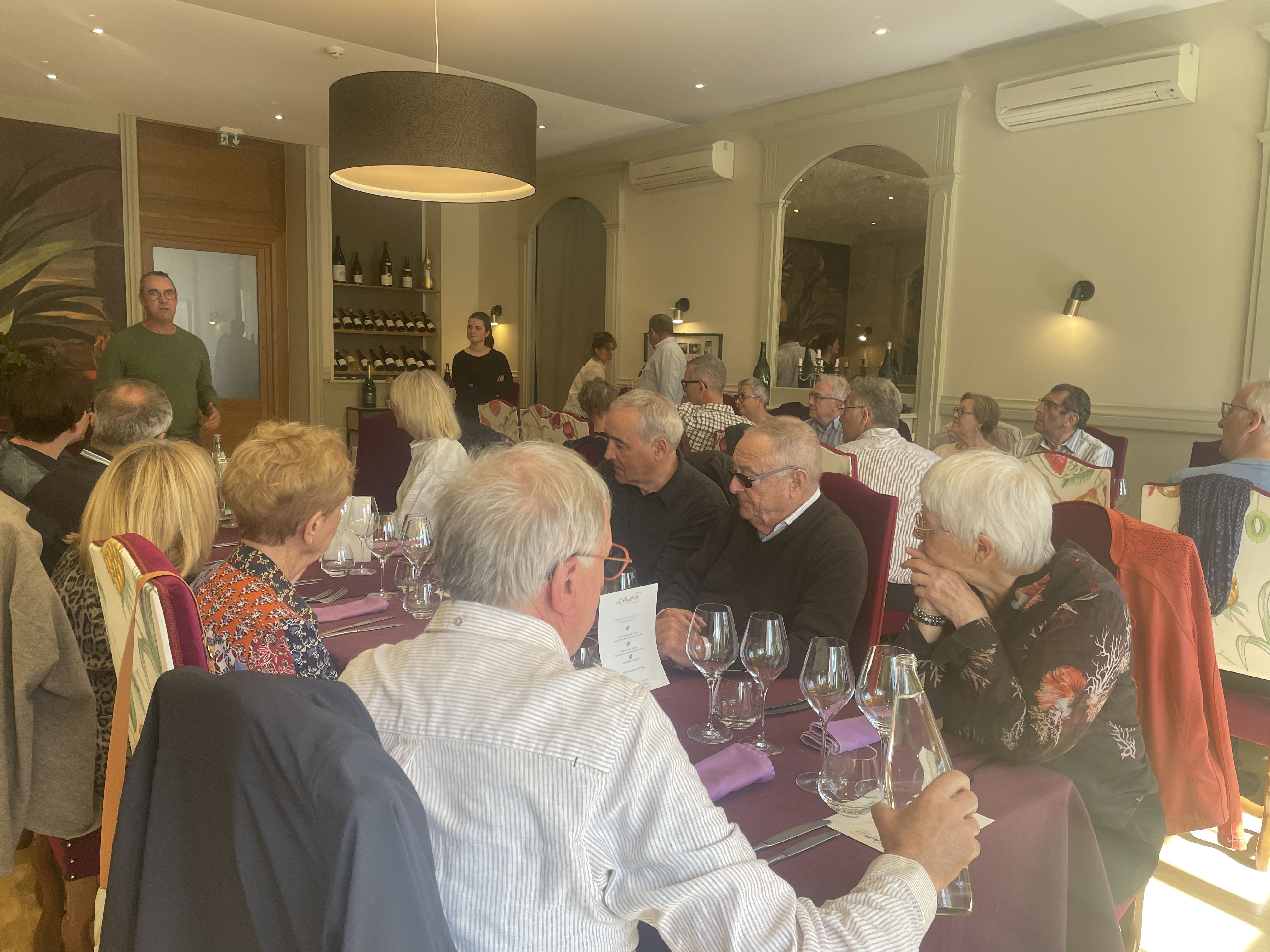 La journée a débuté au domaine, accueillie par Canovia et Hervé, Claude et Capucine Muzard. Dans une ambiance typiquement bourguignonne, les 26 participants ont pu découvrir la dotation de l’année : le Meursault Meix Chavaux 2024. Accompagnée de gougères au comté, cette dégustation a ouvert les festivités de la plus belle des manières. Au-delà du plaisir du palais, la matinée fut également instructive avec la présentation d'une note de marché détaillée. Cette dernière a permis de faire le point sur l'état du marché viticole bourguignon en 2024-2025, un focus sur l'appellation Meursault ainsi que le GFV Terroir de Meursault.